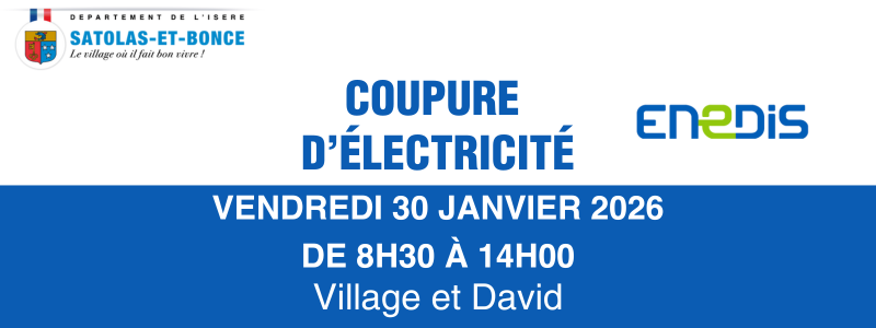 Coupure d’électricité ⚡ Enedis interviendra sur notre réseau le vendredi 30 janvier 2026 entre 08h30 et 14h00. Quartiers et lieux-dits concernés : De 8h45 à 11h45 : Impasse Marius Berliet (Toutes les [...]